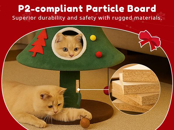 It uses eco-friendly particle board and soft plush covering, safe and durable for cats.