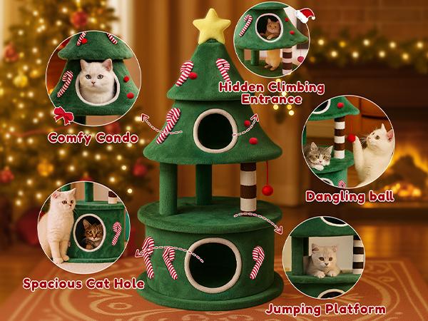 Multi-level fun, cozy retreats, and festive play for your cat!