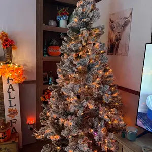 Transform your home with a full, frosted tree adorned with warm LED lights, perfect for festive decorating and cozy holiday vibes.