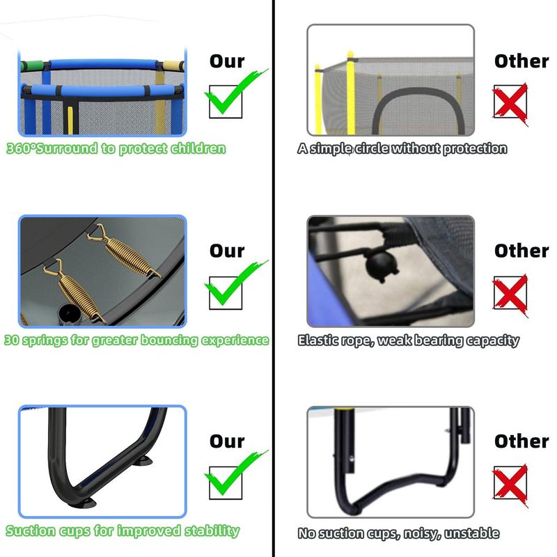 A: Superior! We use 30 heavy-duty galvanized springs (not weak elastic ropes). This creates a stronger, more reliable, and more elastic bounce that lasts longer than standard models.